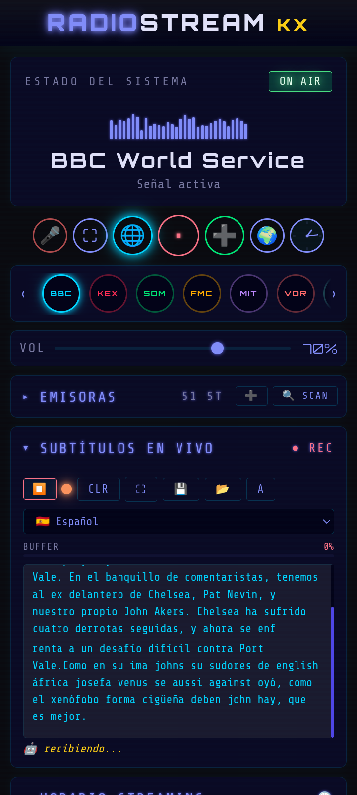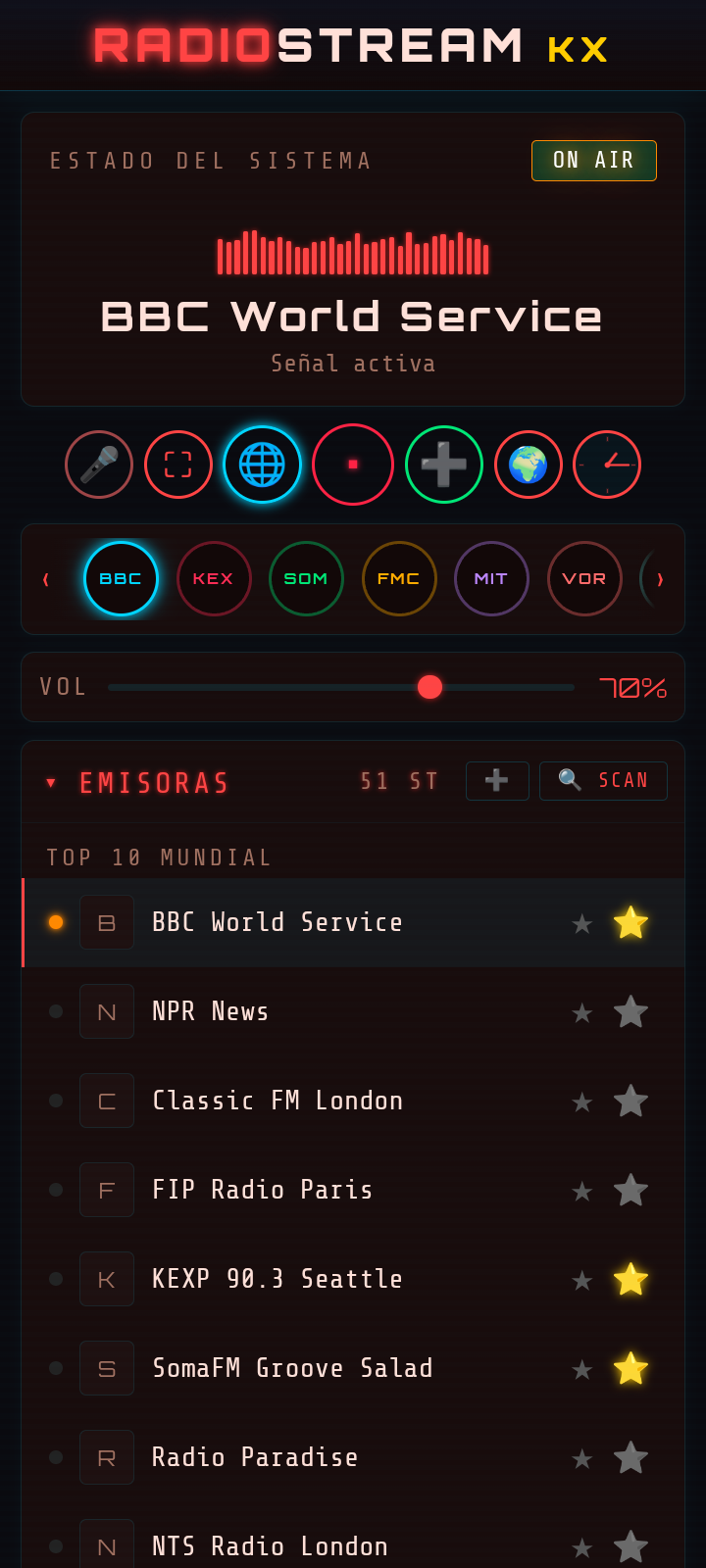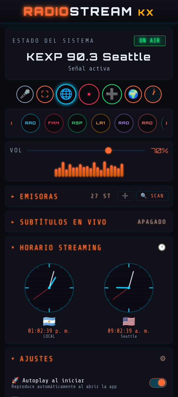 **Radio Stream KX** — The ultimate app to listen to world radios with real-time transcription.