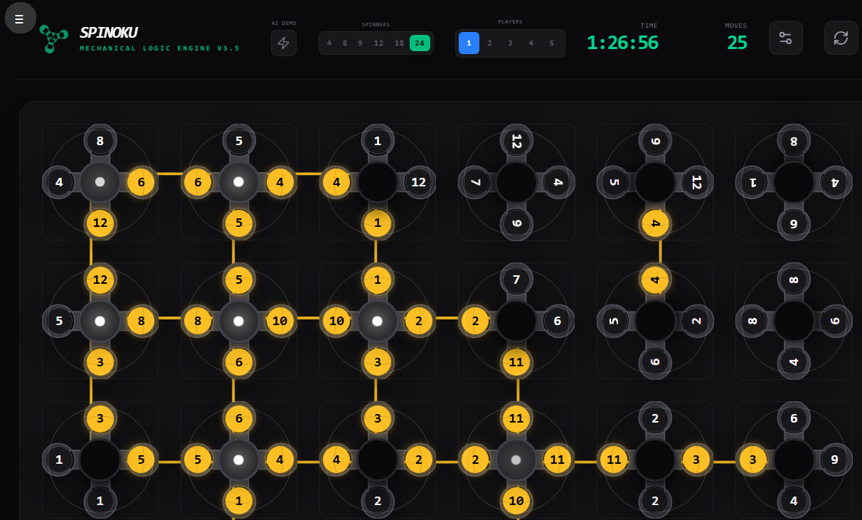 An innovative puzzle game that combines mathematical logic with rotational mechanics. Each spinner has numbered arms that you must align correctly to solve the entire board.